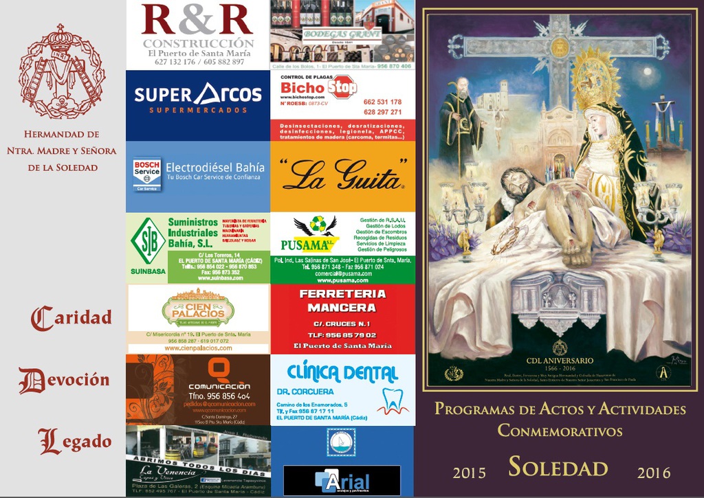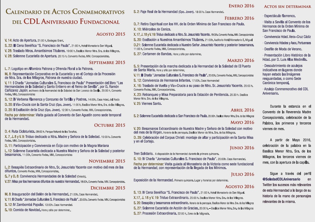During this year, which began last August 28, 2015, we performed various social, cultural and charitable activities. Among them include the Cultural Days "San Francisco de Paula" with various themes and the latter being the presentation of the book "A Royal Brotherhood: Solitude of Puerto de Santa Maria" by D. Luis Alba Medinilla, showing all the information collected about our Brotherhood since its foundation. A cycle route, various special cults, a Solidarity train and a presentation of our Brotherhood marches dedicated to short this year of celebrations.