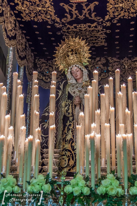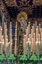 paso de Palio de Nuestra Señora de la Soledad, que cierra un cortejo de nazarenos morados y negros.
